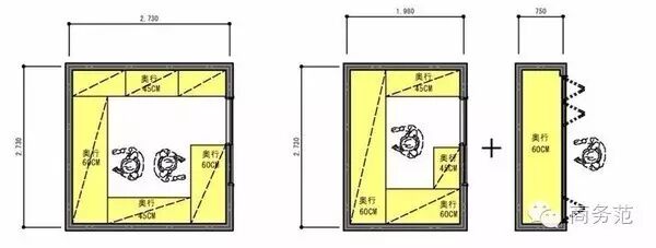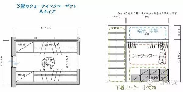 上圖左圖一個純粹作為收納空間的衣帽間的布局,麵積大約為7.5平米。考慮布置衣櫥(進深600mm)和普通收藏櫃(進深450mm),收藏部分的麵積比例大約為52%。