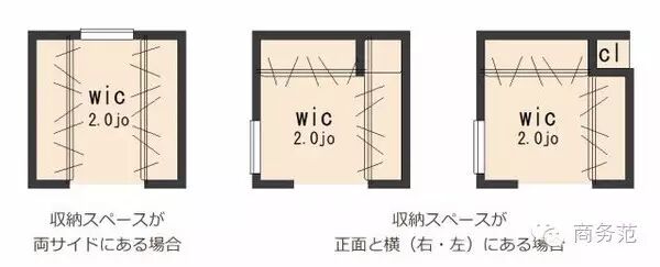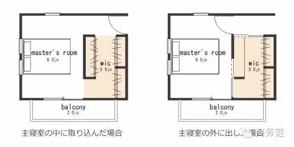 例如在下圖中,左圖是衣帽間在臥室內的情況,進門之後可以再穿過衣帽間;右圖為衣帽間設置在臥室外的情況,可以穿過衣帽間進入房間,也可直接進入臥室。