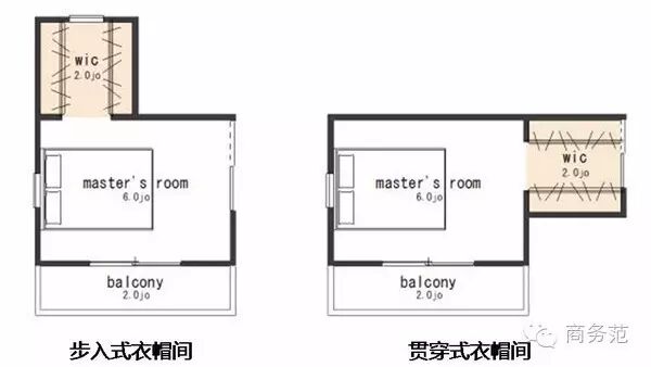 如下圖左就是一個“步入式”的空間,而右圖則是將其作為進入臥室的前室來處理,兩者的差別就在於是否貫穿。