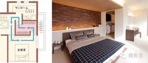 按照這種邏輯可以衍生出新的布局方式和使用模式來。例如用衣帽間連接臥室和榻榻米(和室,常常作為茶室使用),是日本常用的方式。