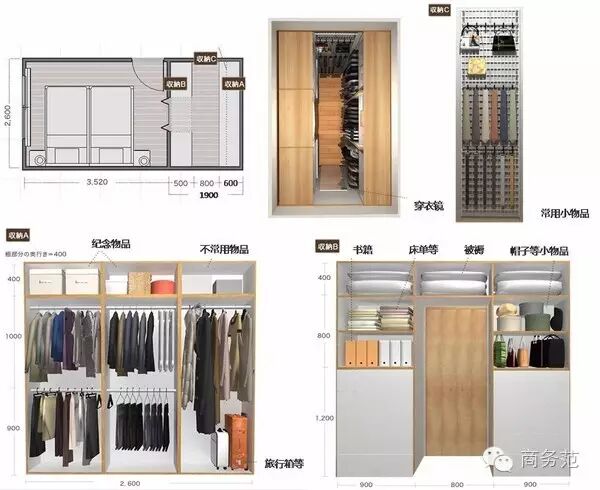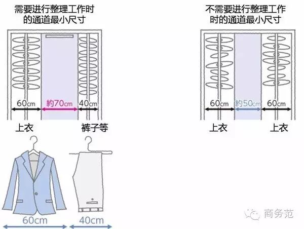 如果內部需要一側設置掛杆一側設置帶門的衣櫃的話,則通道的寬度最好能夠增加到900mm,便於打開衣櫃門。