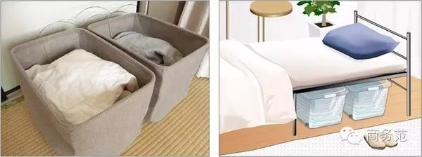 ①上部通常難以夠著的空間中設置換季的物品收納箱