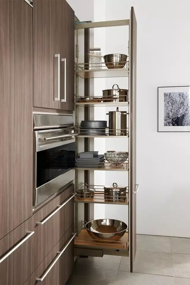 各種組合櫥櫃,通過立體架構來最大限度的擴展廚房的空間,同時也方便分類收納廚房用具和食材配料儲存,保證了廚房表麵的簡潔幹淨。