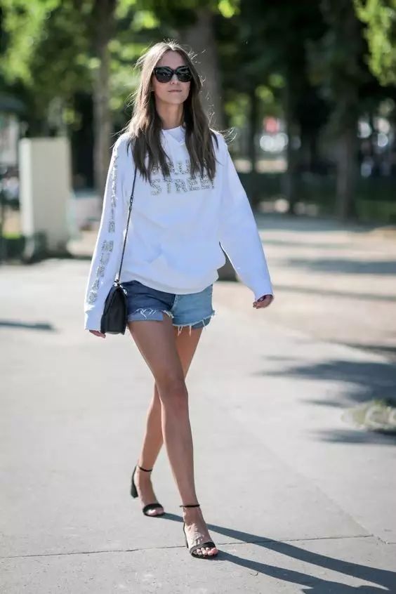 牛仔短褲+衛衣 之前搭姐就推薦過,衛衣是這個早秋可以承包外套和內搭的絕佳之選,搭配牛仔短褲,視覺上厚下薄的季節衝撞充滿了時髦氣息。▼