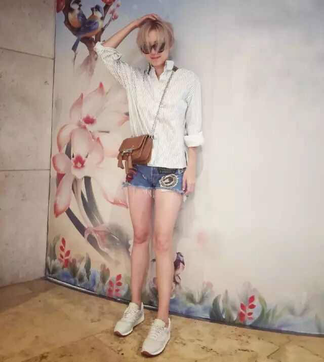 牛仔外套+牛仔短褲 絕對是中韓女明星今秋私服街拍中的第一名。丹寧風的自由感體現的淋漓盡致。▼