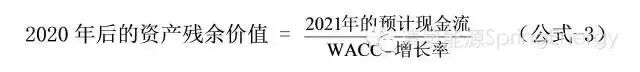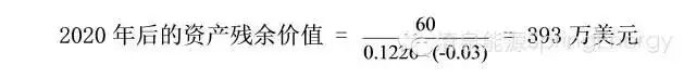 為了估算ABC公司在2020年末的殘餘價值,需要得到兩條信息。首先,要知道該公司資產現金流在2020年後的變化情況。鑒於2006年後,ABC公司的產量逐年下降,可以假設公司銷售額的下降率等於產量的下降率,為3%。其次,還需知道該公司的加權平均資本成本(WACC),根據它可以將2020年後的永續現金流折現成現值。然後我們就可以根據DCF公式(公式-1)的變形來估算資產的殘餘價值。