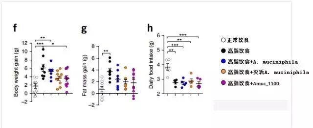 不同飲食搭配下小鼠體重增長(f)、脂肪量增長(g)和日均食物攝取量(h)對比