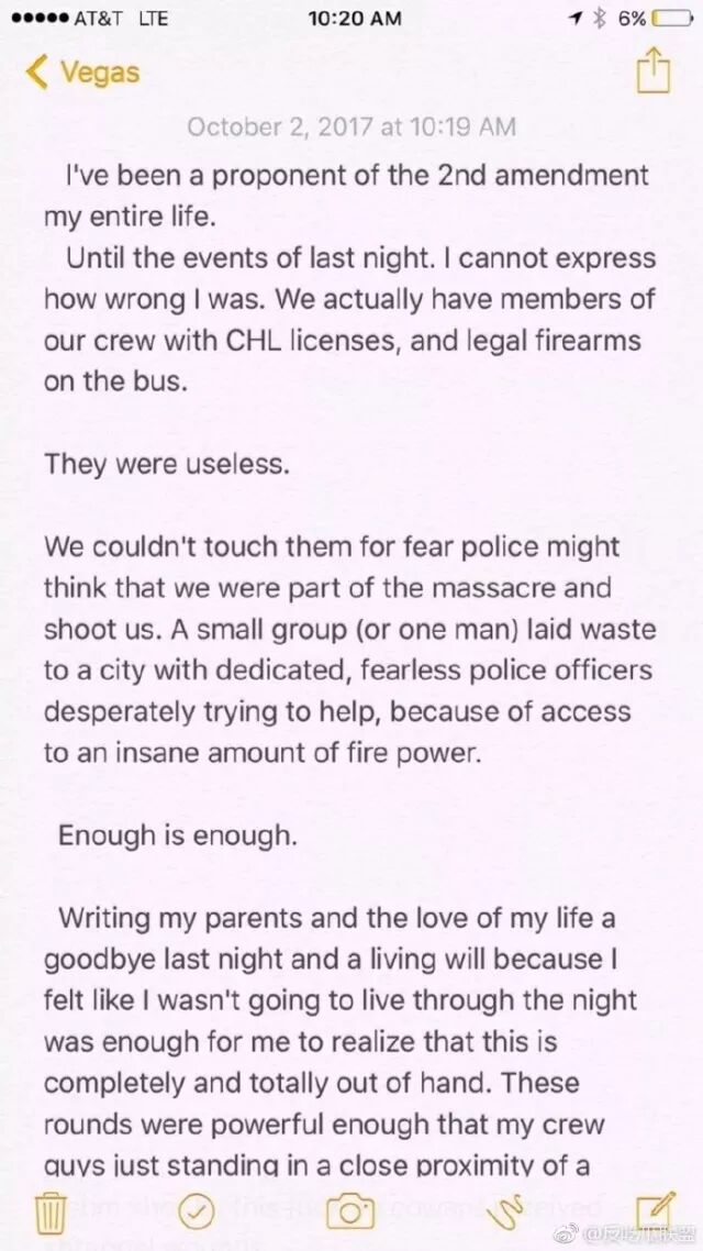 大意:我是槍支擁有者和堅定的持槍權擁護者,我們的車裏有槍,但在昨晚我不能拿他們,因為可能會被認為是槍手。我發現槍支並不能保護我們的安全。我的朋友被子彈碎片擊中。我受夠了,槍支管製必須實行。