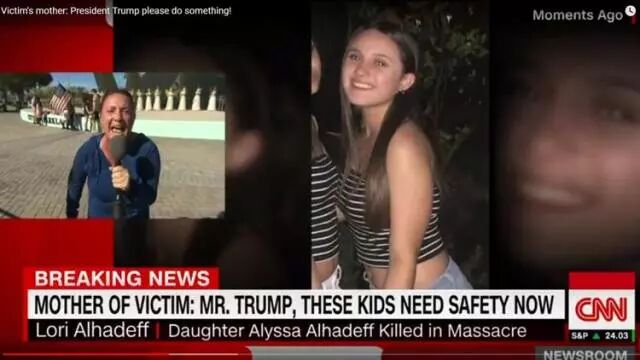Lori Alhadeff 14歲的女兒在本次槍擊案中被殺。這位絕望的母親在電視前向流著淚質問總統: