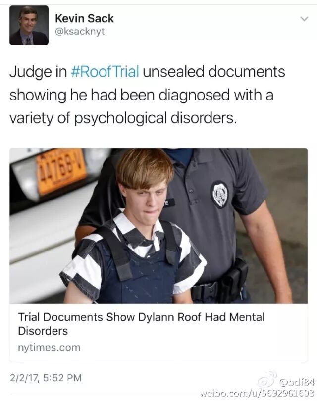 一個月後,南卡教堂槍擊案的庭審文件披露,在教堂中殺死9人的Dylann Roof患有精神障礙。