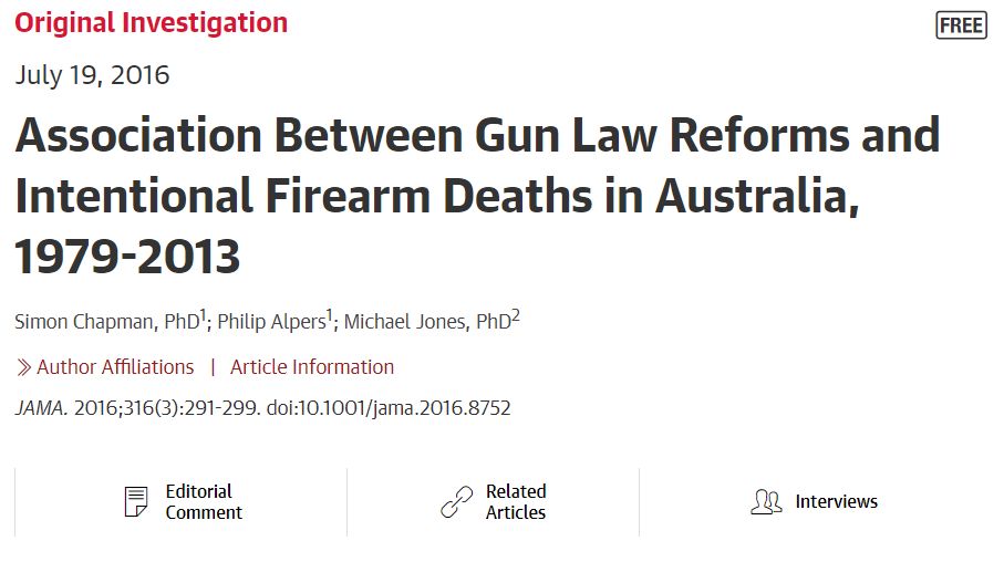 美國醫學學會在去年發布的一篇學術文章指出,1996年澳大利亞連發大屠殺血案,最嚴重的一起是26歲的Martin Bryant拿半自動步槍亂掃,殺死35人。澳洲國會迅速通過新法,嚴禁半自動和自動武器,現有武器必須回賣給警局。自1996年至今,澳洲再無大規模槍擊案發生 。(via @勿怪幸)https://goo.gl/1DLd86