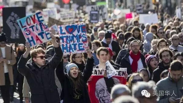 為此,紐約市長白思豪高調呼籲全國民眾繼續抗議,以保護婦女和同性戀人士等的權益。這是一種傳統的非暴力抗爭,其目的是為了抵抗、矯正民主體製下重大的不公義。示威者除了要求川普下台之外,喊出了一個最響亮的口號:“愛戰勝仇恨! ”