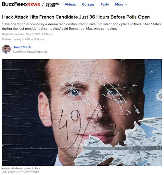 5月5日的民調顯示馬克龍以61.8%領先於勒龐的38.2%。黑客針對領先的候選人在大選前爆出對其不利的材料,試圖影響選情,和幾個月前在美國發生的事情有著驚人的相似之處。