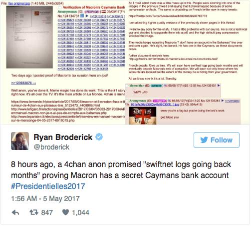勒龐在本周的電視辯論中指控馬克龍有“離岸銀行賬戶”,馬克龍予以否認並報告給法國競選官員,但匿名社交網站4chan上馬上出現許多“有圖有真相”但似是而非的“證據”來支持勒龐的指控。