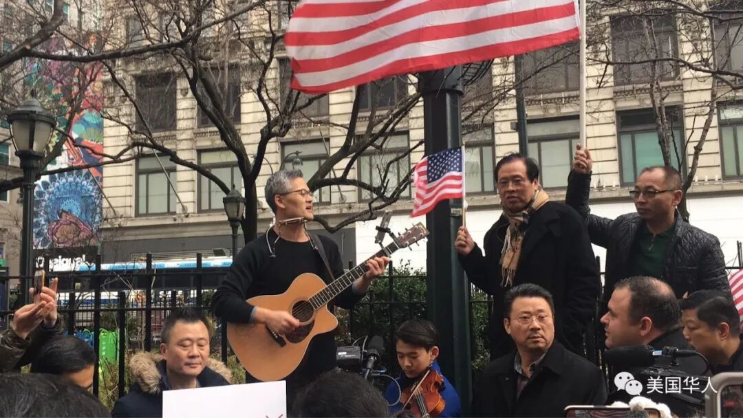 福州同鄉會是今天集會的主力之一。美國福建公所朱顯秋秘書長(右二)對快速發動華人參加集會起到關鍵作用。