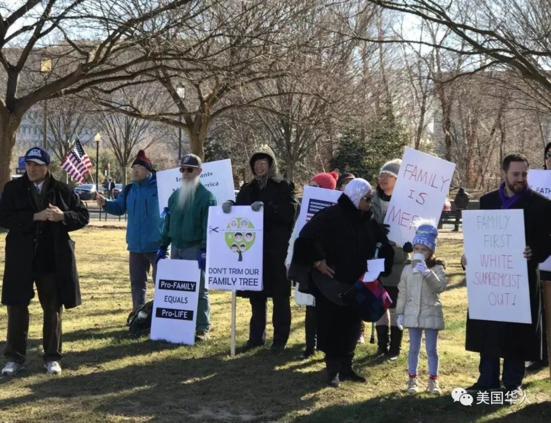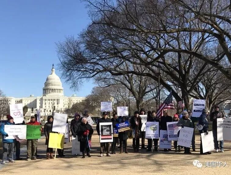 " I had a pretty long talk with a reporter at NBC news and helped her understand the impact of eliminating family immigration on the Asian culture of taking care of our parents. And also educated her about the impact of the one-child policy, resulting in the only child in the US and parents in China without younger generation to support them. She appeared surprised to learn about this. Also she was surprised we were out there with many whites and Hispanics. Usually you don't see many Chinese with mainstream protests and Chinese protests hardly draw others to join. " (翻譯:我與NBC的一位新聞記者進行了長時間的交談,並幫助她理解家庭移民對重視孝道的亞洲文化的影響。 跟她科普了關於獨生子女政策的影響,移民美國的獨生子女在中國的父母沒有年輕一代後輩照顧他們安享晚年。 她對這一點很驚訝。另一個讓她吃驚的地方是,遊行有許多白人和西班牙裔人參加。 通常你不會看到許多主流抗議中出現華人,而華人的抗議也很難吸引其他人加入。)
