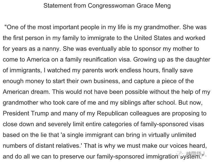 國會眾議員孟昭文(Grace Meng),紐約州參議員Tony Avella和紐約州眾議員Yuh-line Niou等分別給集會組織方發來支持申明。孟昭文的申明中提及自己就是家庭移民政策的受益者,而她家三代移民實現了從保姆到國會議員的美國夢的奮鬥。孟昭文在申明中同時對汙蔑家庭移民方式可以無限製移民遠親的謠言,進行了駁斥。