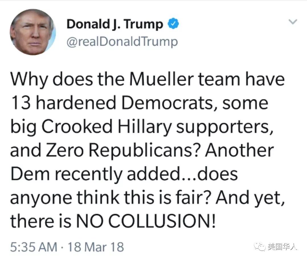 而且,非常罕見地,他第一次在推特上點了特別檢察官穆勒的名字,稱通俄調查“根本不應該開始”,是“獵殺女巫”。