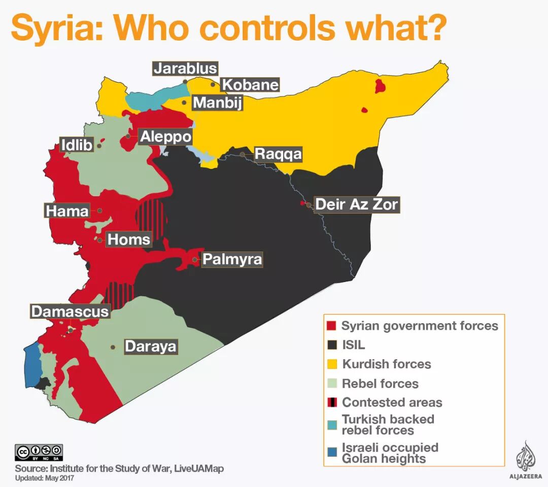 上麵是2017年5月敘利亞各派領地圖。紅的是政府軍,黑的是ISIS,綠的是反對派,黃的是庫爾德人,左下角藍灰的一小塊,是以色列占領的戈蘭高地。