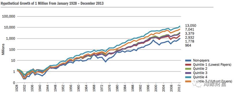 曆史經驗表明,股票投資的收益裏麵,有一半來自於股價成長,而另外一半則來自於股利發放。根據上圖統計數據,從1928年到2013年,如果投資者選取高派息股票,綜合收益率可能會達到不派息股票的10倍之多。進入2017年,尋找High Yield仍是值得投資者花時間去研究的一個話題。那麽當前市場有哪些值得關注的高息投資標的呢,海鯨金融投研部帶給我們如下分析: