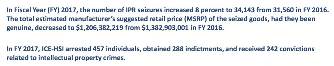 每年聯邦移民和海關執法局、國土安全調查處都會查獲多起中國假貨的走私案件,根據2017年全美知識產權緝私數據(Intellectual Property Rights Seizure Statistics Fiscal Year 2017)顯示,有關部門共查獲3萬4143起仿冒品案,較前一年同期增加8%,其中78%的來自中國,價值達9億4000餘元。