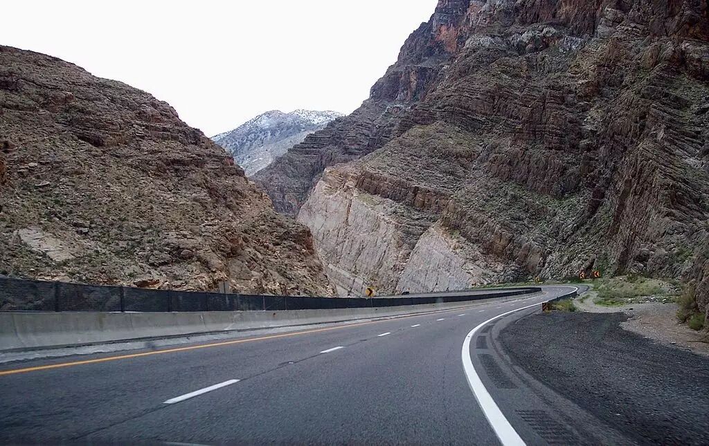 以上四條路線從聖喬治(St George)到拉斯維加斯部分是一樣的,小猴想順便提一下這一段的風景。如果你很晚才從佩吉出發,到聖喬治的時候估計已經天黑,後麵的風景也就看不到了,但如果天還亮著,路上還是有些不錯的風景的。離開聖喬治跨過猶他(Utah)和亞利桑那(Arizona)邊界之後會進入維琴河峽穀(Virgin River Gorge),過了這段之後路左手邊又有拔地而起的邦斯山(Mt Bangs)。
