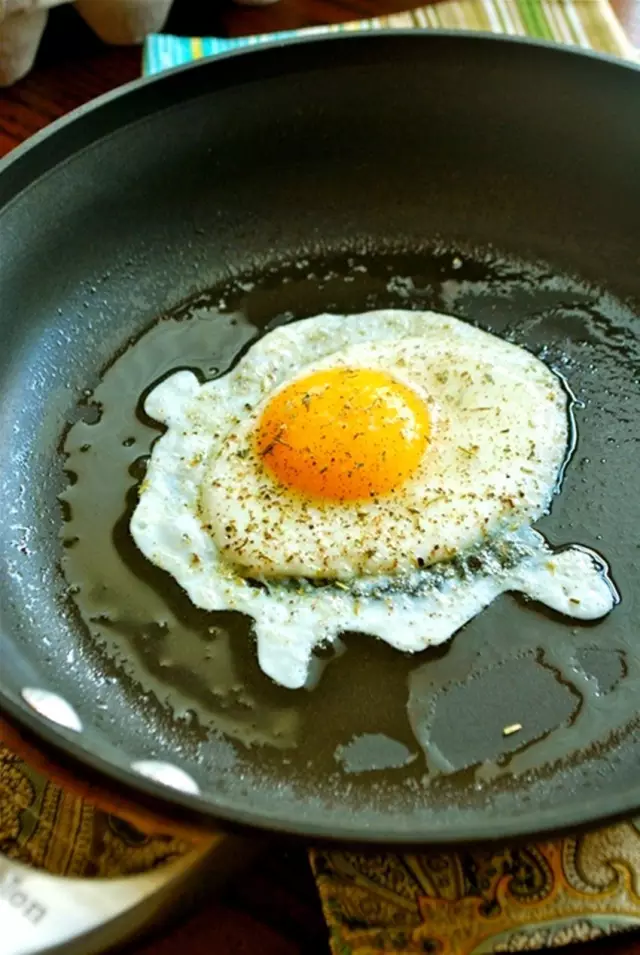 5、然後用小火持續煎1-2分鍾,蛋黃熟了後撒上調料即可起鍋。