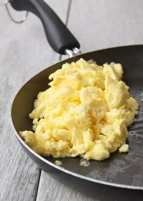 3、再把碗內的蛋倒入熱鍋中(鍋內雖然是冷油,但鍋的溫度仍然很高),即刻關小火,可避免雞蛋被燒焦;