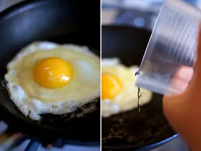 4、此時,蛋黃還不熟。先撒上兩勺熱水,蓋上鍋蓋,1分鍾後當蛋清有些凝固時,再往雞蛋上撒上兩勺熱水,即刻蓋上鍋蓋。