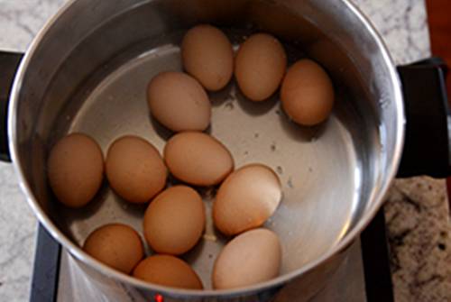 將雞蛋放入冷水中,慢火加熱,沸騰後用小火煮3分鍾,再關火浸泡5分鍾。