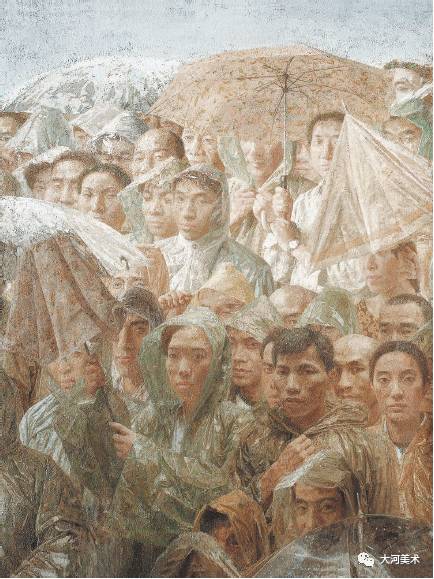 我那時在廣州美術學院教書,當時廣東珠三角是一個世界加工廠,汙染嚴重,我住的地方是一個有好多煙囪的環境,每天熏得夠嗆,再加上廣州的雨季很長,空氣很潮濕渾濁,雨很髒。所以我就構思了酸雨這麽一個作品。畫麵霧氣蒙蒙,許多人打著傘,有一種無助無力的感覺。這張畫在形式上我也做了一些探索,畫麵黑白對比很弱,沒有主人公,也沒有情節。