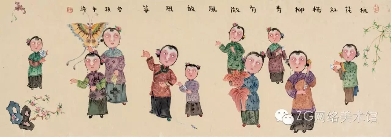 值得注意的還有畫家在《四時即景》中的題字,亦頗有情調。摘兩則來讀:“春天裏:草如錦,花如繡,姊妹立花前”;“夏日庭外天氣好,姐妹們下棋心情好”;“枝頭小唱聽得出了神兒,好清音”“光陰好,和風細細陽光照,莫煩惱,全拋了”……文字清秀天真,與畫麵相得益彰。