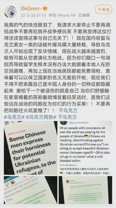 一個三無小賬號在微博上發布了一篇小作文,細數中國人在烏克蘭事件中的幾大罪狀,然後就被轉爆了,甚至引起了有些主流媒體的轉發。