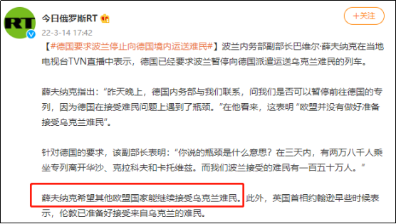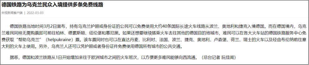 德國交通部門也大咧咧宣布,所有持有烏克蘭護照或身份證的難民,可免費乘坐從波蘭前往德國的火車前往德國,並且還會和波蘭方麵商討加開班次,讓更多難民疏散前往德國。