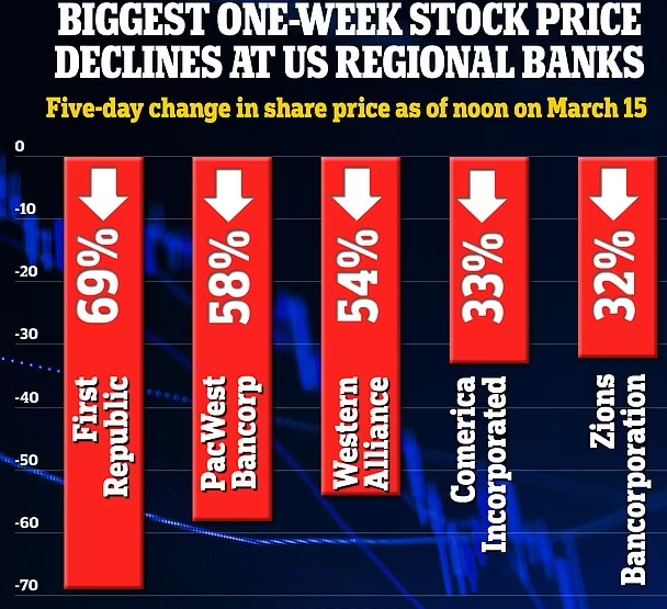 花旗銀行股價下跌5%,高盛、摩根大通和富國銀行(Wells Fargo)均下跌約4%,美國銀行股價下跌約3%。嚇壞了的不止銀行股!