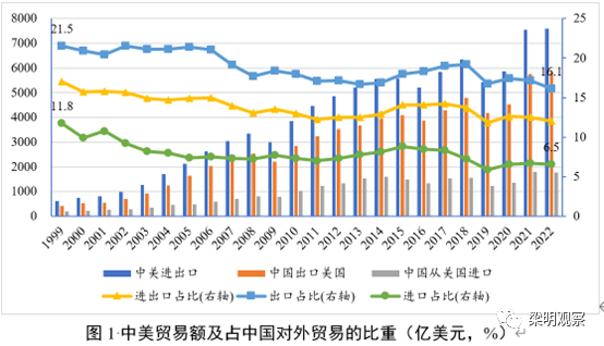 從圖1可以看出,中美貿易額占中國對外貿易的比重整體延續了下降的趨勢,中國對美國出口所占的比重已經從1999年的21.5%下滑到2022年的16.1%了。從圖2也可以看出,自從2017年美國發起對華的貿易戰以來,美國與中國貿易額所占的比重也在穩步下降。但美國從中國的進口額依然在創曆史新高。美國與中國的經貿脫鉤,降低的是對中國的依賴度,降低的是相對重要性。美國短期內在經貿上完全與中國脫鉤既不現實也不可能,長期脫鉤可能需要較長一段時間。也就是說,未來一段時間,中美貿易的份額可能會持續小幅下降或者低位保持穩定,但中美貿易額有可能還會再創新高。
