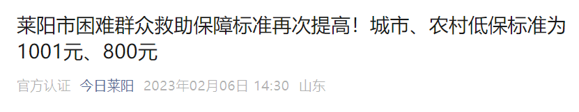 2023年2月,山東省萊陽市官宣稱,自2023年1月1日起,城市低保標準由原來的每人每月953元提高到1001元;農村低保標準由原來的每人每月745元提高到800元。目前,全市已完成近一萬餘名困難群眾的提標審核工作,切實保障了困難群眾的基本生活。
