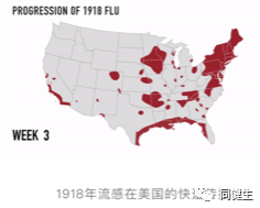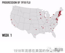 沒有科學依據,俺不敢瞎想。不過,俺看到一個對1918年流感大流行在美國流行的可視化回顧,覺得對理解現在美國的瘟疫流行有所幫助,所以也把那個動態視頻的截屏搬到這裏實現數據共享: