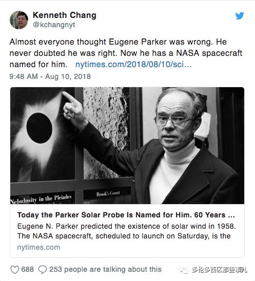 如今,尤金.帕克(Eugene Parker)已經是芝加哥大學名譽教授、天文學家,退休20年的帕克距當年論文發表已過約60年,然而,NASA的“帕克號”才正要登空,也是NASA首次以在世人物命名太空船。