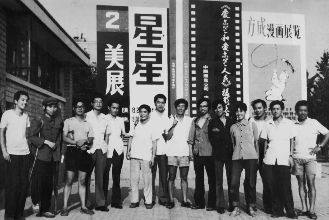 1980年星星畫會成員在中國美術館(星星第二屆美展)廣告前合影,左起:馬德升 肖大元 鍾阿城 楊益平 薑雲 李永存 曲磊磊 黃銳 嚴力 李爽 王克平 陳延生 張世琪。