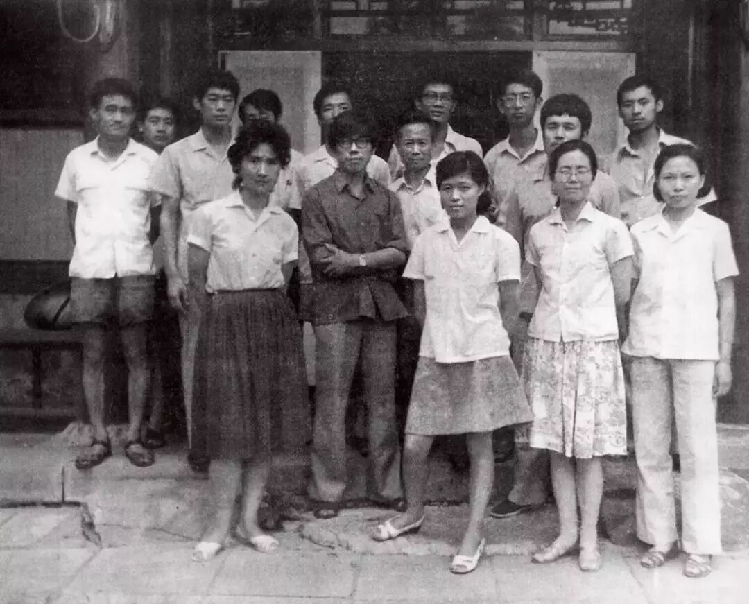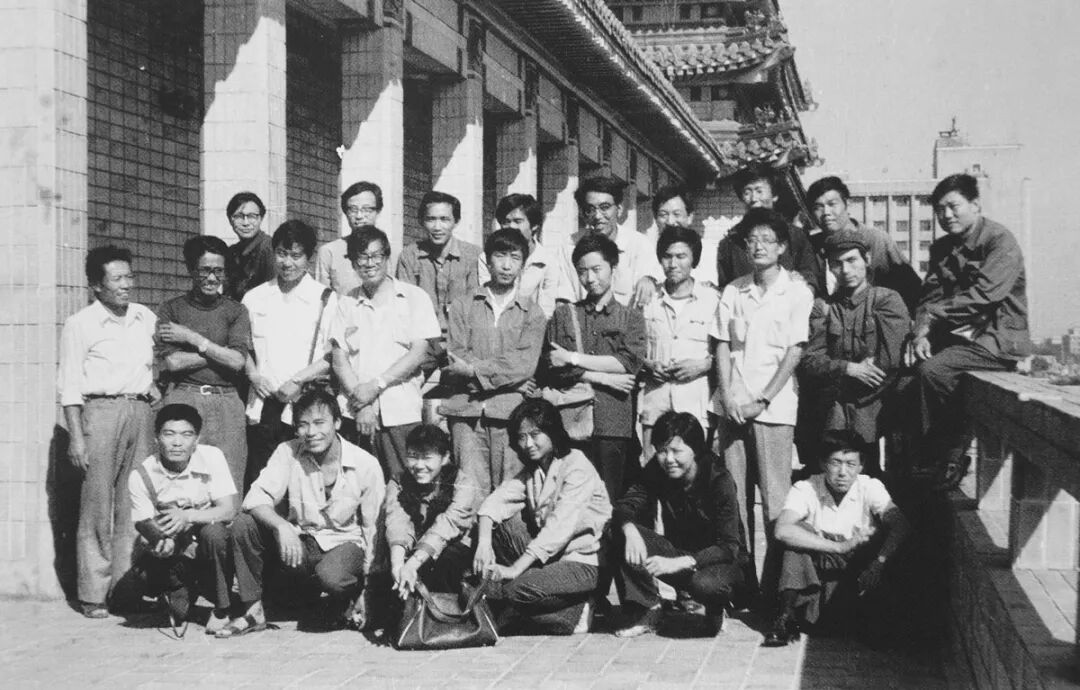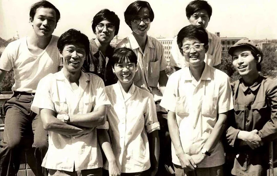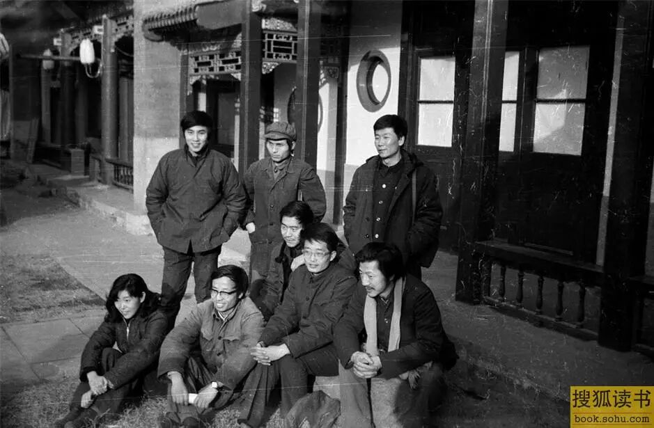 1980年星星美展部分成員在北海畫坊齋合影。左後依次為:嚴力、馬德升、曲磊磊;左前:李爽、黃銳、李永存、鍾阿城、袁運生。