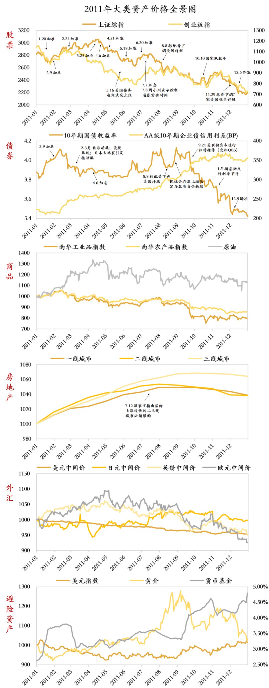 房地產:牛熊轉換。進入2011年,房地產調控政策仍然嚴格,流動性也不斷收緊,房價處在頂部的慣性上漲;直到7月,溫家寶總理指出房價上漲過快的二三線城市必須限購,這一輪房地產牛市才得以終結。全年百城樣本住宅平均價格上漲4%,一、二、三線城市分別上漲4%、4%、6%。