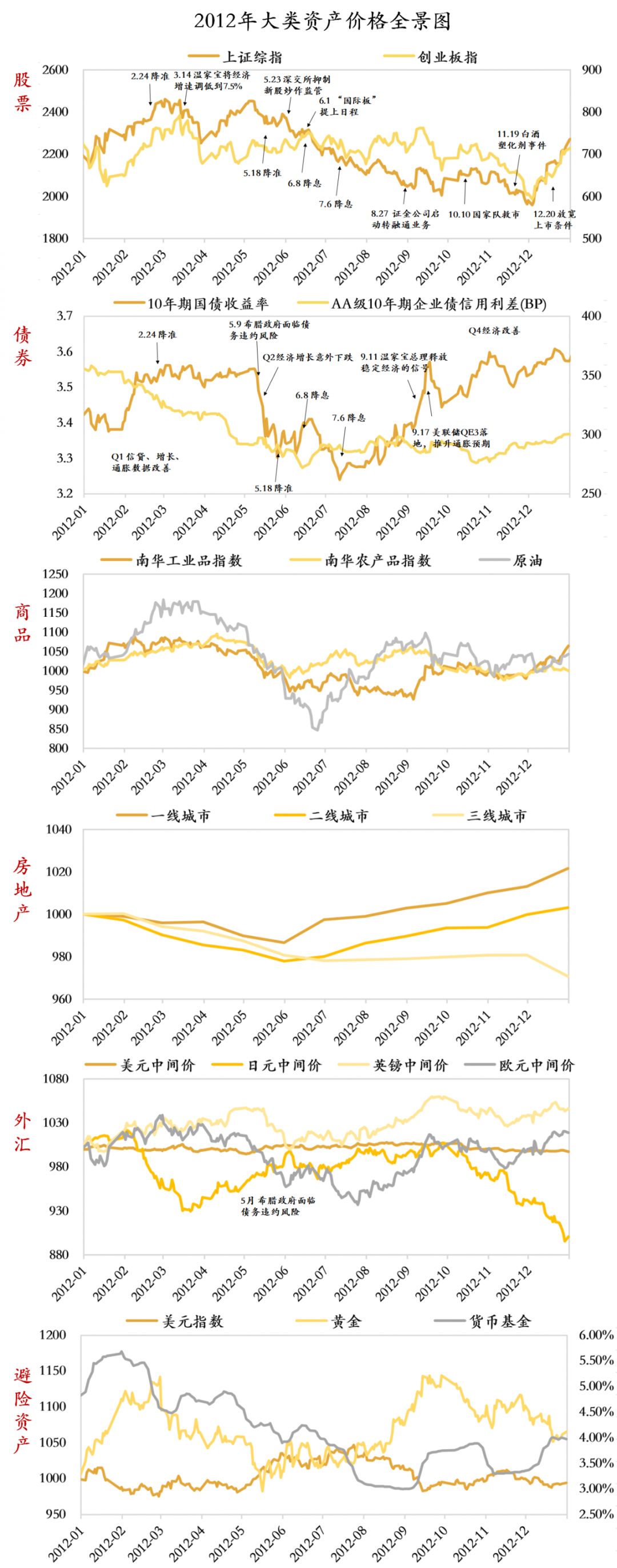 股票:震蕩。2012年股市整體以震蕩為主,上證綜指走出“N”型走勢,全年上漲3%,創業板下跌2%;全部A股中有44%的個股上漲;股票型基金平均收益5%,中位數5%。2012年是政府換屆之年,政策動向不明確,市場整體萎靡,成交量降至低位;四季度經濟數據改善,年底中央經濟工作會議提出了次年經濟工作的六項任務,市場信心大增,金融風格指數在12月上漲25%,以全年漲幅26%領漲。