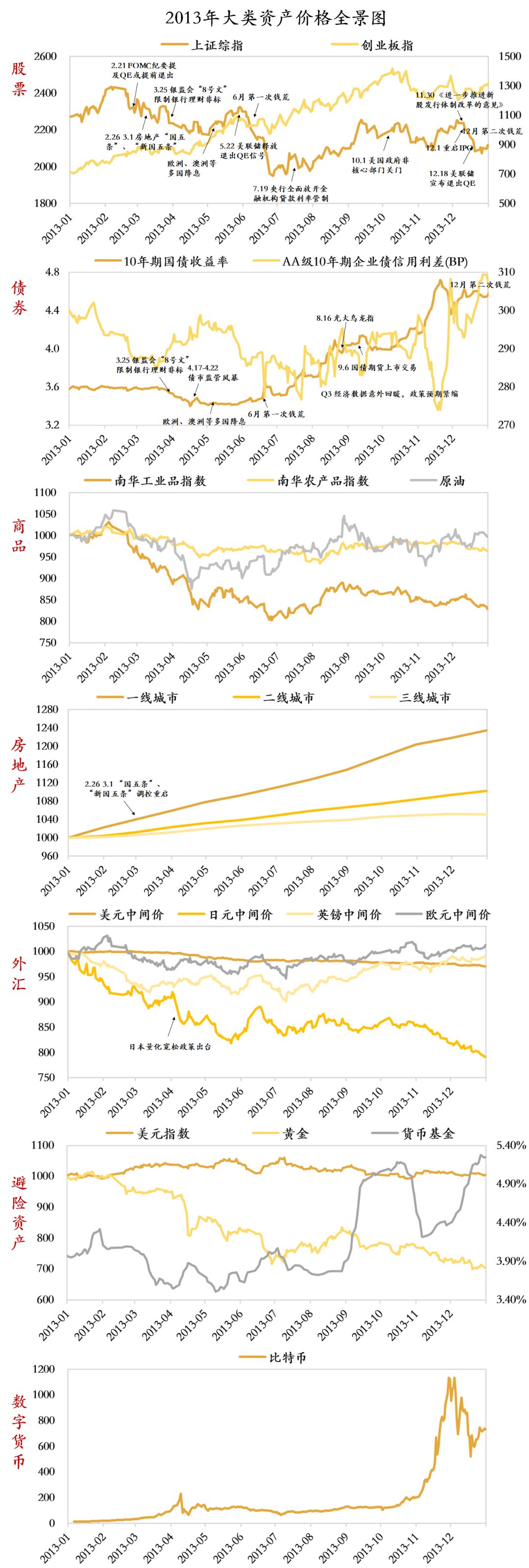 數字貨幣:大熊市。比特幣價格全年下跌56%。2013年塞浦路斯債務危機所引發的傳統金融機構信任危機,比特幣價格暴漲近,很多炒家入場比特幣市場;此後不少國家加強了對比特幣市場的監管,而市場情緒也有所平抑,導致比特幣價格低迷。