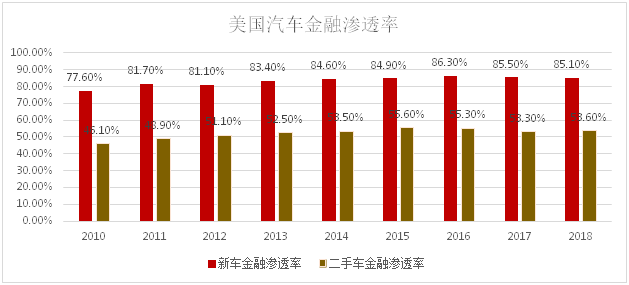美國新車和二手車金融滲透率在2010到2018的8年間一直穩步上升。
