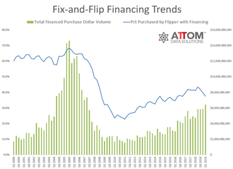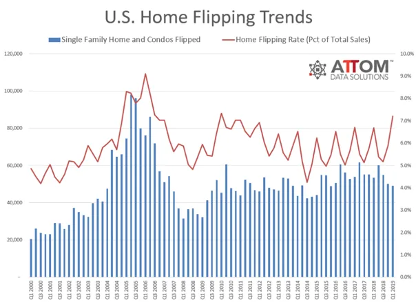 2019年第一季度,美國房屋翻轉貸款總金額達到64億美元,比2018年第一季度的47億美元增長35%,創下了12年的新高。2019年第二季度住房抵押貸款購買的總美元金額為84億美元,占購房總金額的41%。房屋翻轉貸款的數量照去年同期增長31%,達到13年來的最高水平。