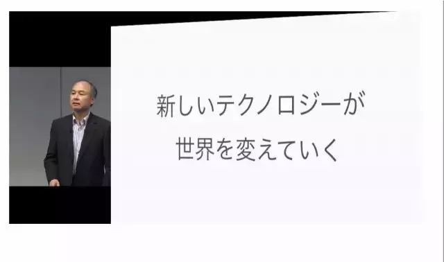 大家好!我是孫正義。剛才播放了開場視頻,我感到非常開心。我認為我們正處在變革的時代當中。產業革命在競爭方麵改變了每個人的生活,而這次的信息革命是要更進一步地帶領我們去往現在每個人都沒有想象過的世界的革命。我們正好在可以挑戰的時候趕上這次革命,真的是非常棒!