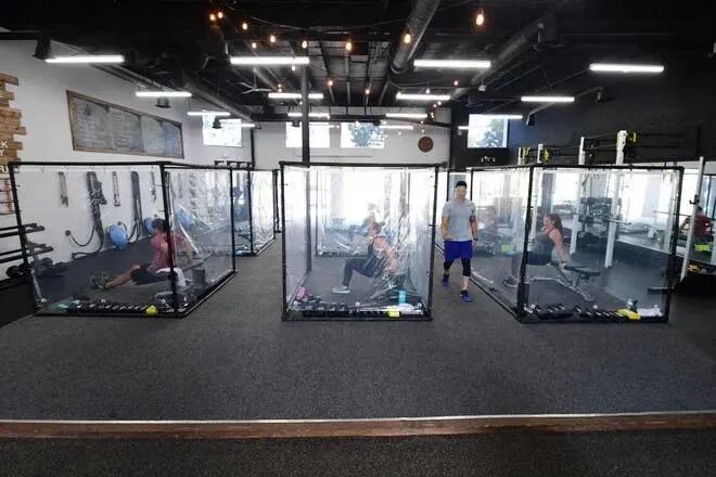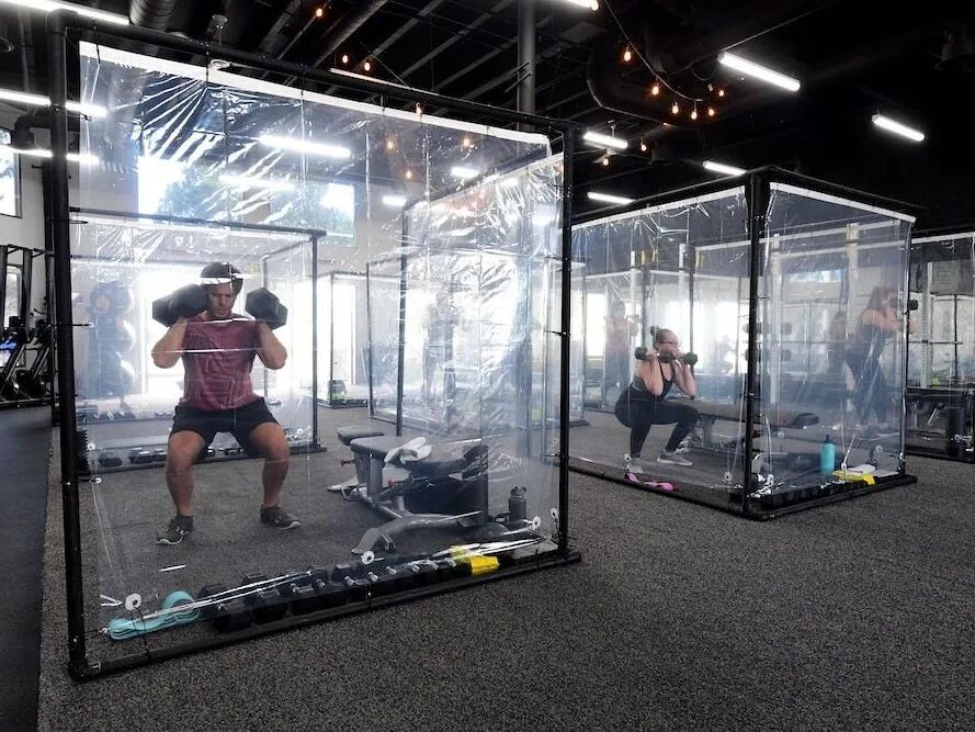 在加利福尼亞州的一個健身房建立了單獨的塑料健身吊艙,使客人可以分組鍛煉並保持社交距離。該健身房在重開前向他們的客人征詢在健身全程戴口罩的問題被否定後,想出了這個點子。