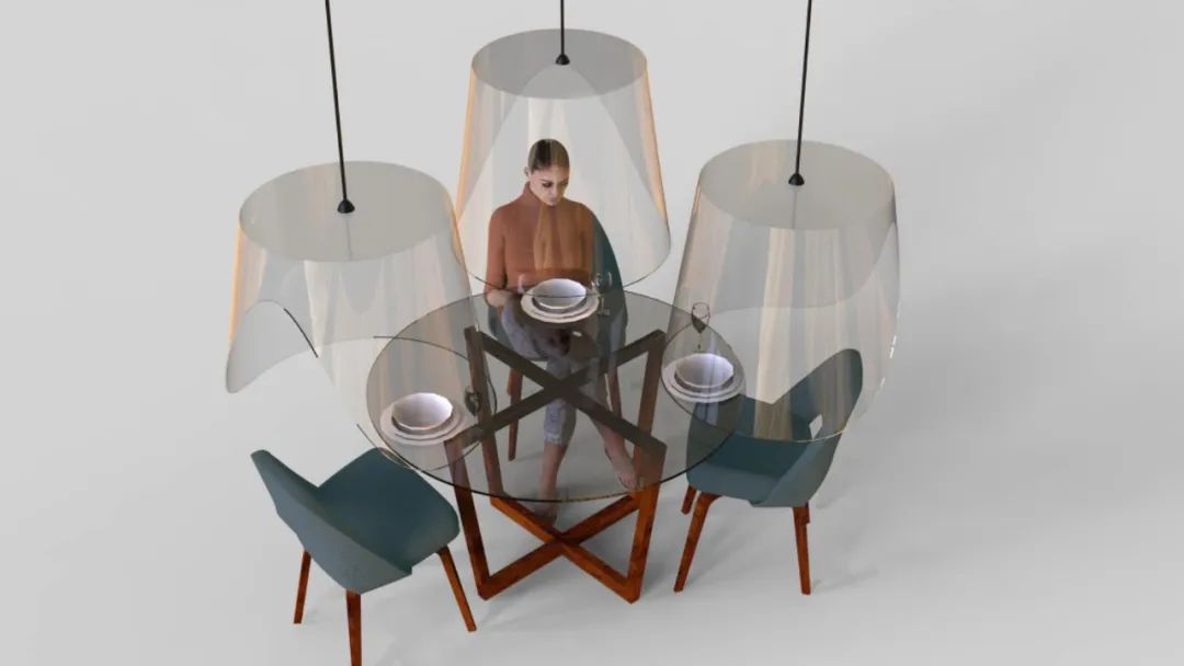 透明的Plex'eat煙囪形狀像大型燈罩,懸掛在桌子上方。人們在進食和飲水時會坐在“煙囪”的下麵,而這個“煙囪”可以減少空氣傳播感染的風險。Plex'eat的建議尺寸為80厘米乘70厘米,設計師還在開發更大的模型,供夫妻和整個家庭坐在一起。