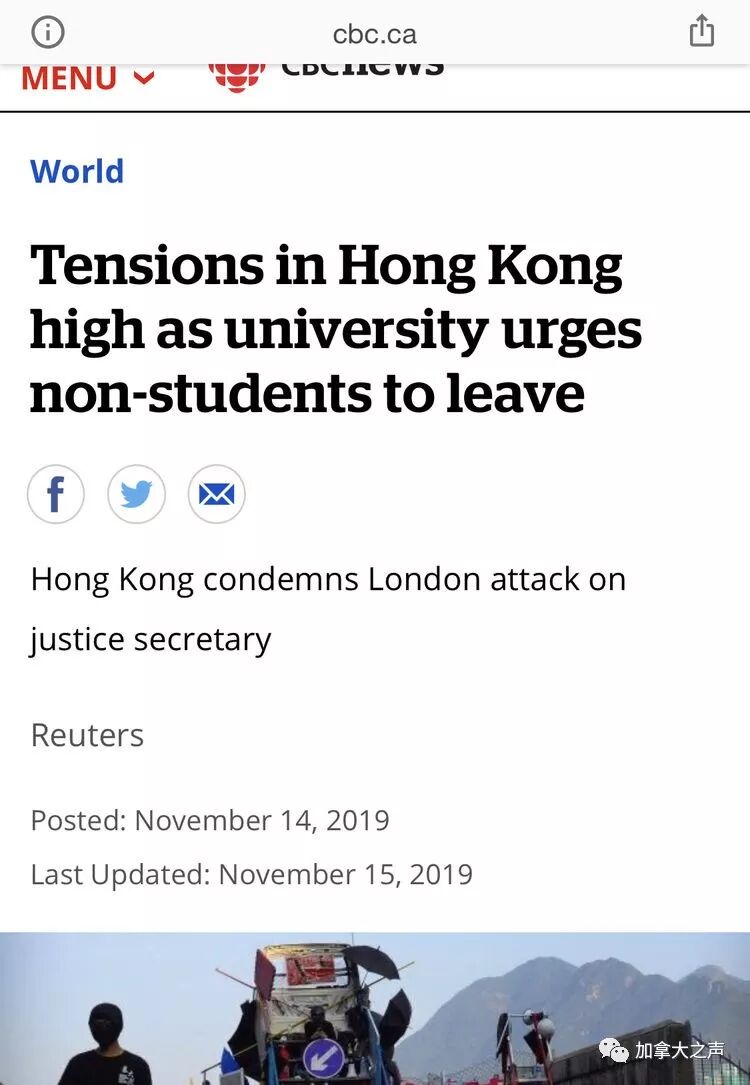 11月14日,加拿大的西媒CBC NEWS綜合報道了兩起最近的香港動蕩新聞: